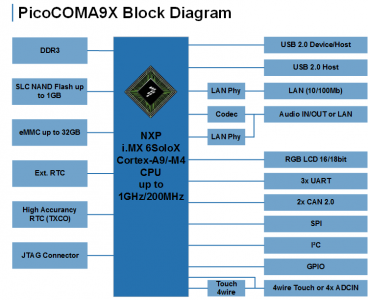 Für Industrie und MedizinDie PicoCOMA9X ist das leistungsstärkste Modul in der PicoCOM Formfaktor. Der PicoCOM Formfaktor ist perfekt geeignet für Applikationen in der Medizin oder Industrie mit kompaktem Aufbau. Leistungsstark dank Cortex-A9 & Cortex-M4 CPUDie PicoCOMA9X basiert auf einem NXP Applikationsprozessor der sehr erfolgreichen i.MX 6 Serie und beinhaltet sowohl einen Cortex®-A9 Kern, als auch einen Cortex®-M4 Kern. In Kombination mit dem NEON Koprozessor können auch anspruchsvolle Aufgaben realisiert warden. Mit dem SoloX hat NXP einen weiteren Applikationsprozessor zu seinem Portfolio hinzugefügt, welcher asymmetrisches Multiprocessing unterstützt. Beide Kerne (A9+M4) sind mit der internen Busstruktur verbunden und haben die Möglichkeit auf alle Peripherien zuzugreifen. |