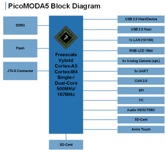PicoMODA5 basiert auf dem NXP Vybrid Applikationsprozessor und wird mit bis zu 500MHz getaktet. Abgesehen von den Signalen de FS-BUS ist das Board pinkompatibel zu seinem Vorgänger PicoMOD6. Analoge KameraDurch die Möglichkeit analoge Kameras anschließen zu können eignet sich das Modul auch ideal für Anwendungen im Überwachungsbereich oder als Rückfahrkamera im Nutzfahrzeugbereich. |