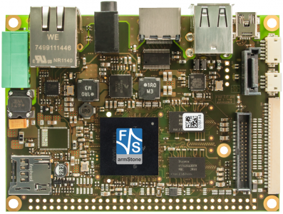 Ohne Basisboard einsetzbarDer Vorteil von Single Board Computern (SBC) ist, dass sie ohne Basisboard eingesetzt werden können und sich so besonders für schnelles "Time-To-Market" eignen. Die armStone™A9/r3 verwendet die NXP i.MX6 Quad-Core ARM Cortex-A9 CPU (NEON, FPU, 3D, MPEG4). LangzeitverfügbarkeitEine Besonderheit ist die lange Verfügbarkeit der CPU von mindestens 15 Jahren (NXP Product Longevity Program). Zahlreiche SchnittstellenDie armStone™A9/r3 ist mit bis zu 4GByte DDR3 SDRAM, einigen GByte Flash und Gigabit Ethernet ausgerüstet. Weitere Schnittstellen der armStone™A9/r3 sind 4x USB 2.0 Host, USB 2.0 Device, CAN, I²C, SPI, Audio, SDIO, PCIe und serielle Schnittstellen. |