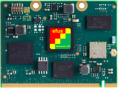 Long-Term AvailabilityAnother characteristic of the i.MX 6ULL/ UL is the long-time availability to at least 2031 (i.MX6ULL) / 2035 (i.MX6UL). efus™A7UL comes with up to 1GB RAM and up to 512MB SLC NAND Flash. Up to 32GB eMMC are available additionally. Various InterfacesThe module offers interfaces like 2x SD Card, 2x 10/100Mb Ethernet, WLAN, BT, 6x Serial, USB2.0 Host/Device, 2x CAN, 2x I²C, 2x SPI and I2S Audio, as well as parallel 8bit camera. LCD TFTs can be connected via 18/24Bit RGB or 18Bit LVDS. Touch is available externally via I²C. The customized operating system (Windows Embedded Compact 2013 or Linux) supports all interfaces, guaranteeing an easy software development without a deeper understanding of hardware. Audio Codec as well as touch controller are found on the base board. Of course, efus™A7UL is pin compatible to efus™A9 and efus™A9X. |