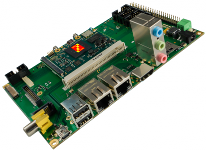 Offers connection options for 2x Ethernet, 3x USB Host, USB Device (OTG), micro SD Card, SD Card, 4x Serial, I²C, SPI, 2x PWM, Audio (Line In, Line Out, Mic), digital/analog Camera, DVI/DisplayPort, mini PCIe and SATA.