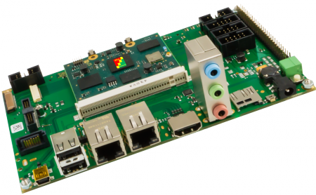Bietet Anschlussmöglichkeiten für 2x Ethernet, 3x USB Host, USB Device (OTG), micro SD Karte, SD Karte, 4x Seriell, I²C, SPI, 2x PWM, Audio (Line In, Line Out, Mic), digital/analog Kamera, DVI/DisplayPort, mini PCIe und SATA.