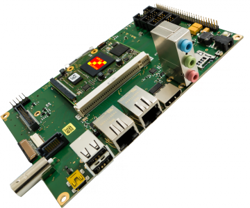 Offers connection options for 2x Ethernet, 3x USB Host, USB Device (OTG), micro SD Card, SD Card, 4x Serial, I²C, SPI, 2x PWM, Audio (Line In, Line Out, Mic), digital/analog Camera, DVI/DisplayPort, mini PCIe and SATA.