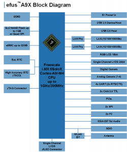 efus™A9X comes with up to 1GB DDR3L RAM and up to 1GB SLC NAND Flash. Up to 32GB eMMC are available additionally. Various InterfacesThe module offers interfaces like 2x Gigabit Ethernet, 4x Serial, USB2.0 Host/Device, 2x CAN, 2x I²C, 2x SPI, I2S Audio, 2x SDIO, PCIe, Camera (analog/digital), WLAN and BT, as well as high accuracy RTC (TXCO). The customized operating system (WEC 2013/ WEC7 or Linux) supports all interfaces, guaranteeing an easy software development without a deeper understanding of hardware. Audio Codec as well as touch controller are found on the base board. WLAN and BT with chip antenna or antenna socket can be offered as well. Of course, efus™A9X is pin compatible to efus™A9. |